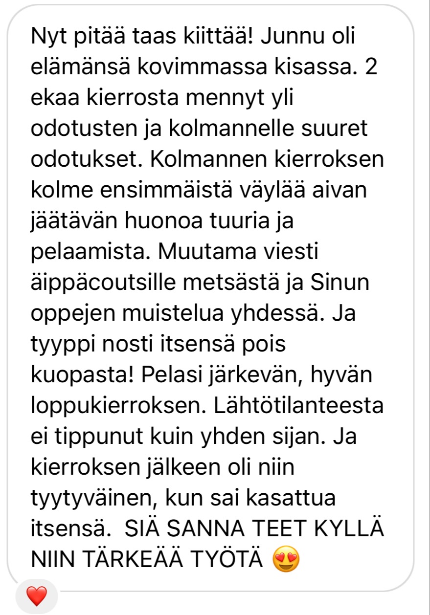 ”Itselle tuli tunne nyt että minulla on mahdollisuus päästä tämän kautta omista henkisistä esteistä mitä omaan harrastamiseen vahvasti liittyy. Tuli tunne ettei ole hätää ja on turvallinen ja hyvä olo ❤️🔥”