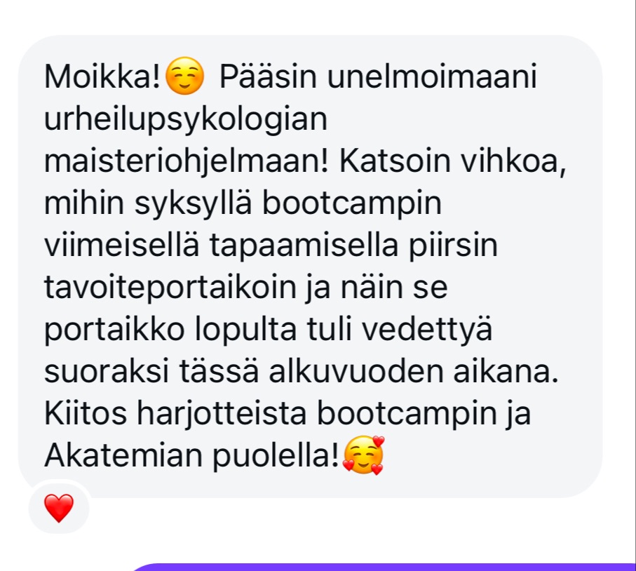 Olen ollut lähes vuoden mukana akatemiassa ja paha kisajännitykseni (jonka takia oksentelin, jumiuduin ja koko elimistö meni sekaisin) on nykyään sillä tasolla, että jännitys on pientä ja mukavaa. Pystyn syömään ja toimimaan normaalisti ja nautin kisapäivistä! Sanna on positiivinen ja kannustava sekä todella ammattitaitoinen. Akatemian harjoitukset ovat helposti saavutettavissa ja ne ovat auttaneet positiivisesti myös muillakin elämän osa-alueilla. Suosittelen lämpimästi, yksi elämäni parhaista päätöksistä on ollut liittyä mukaan 🔥