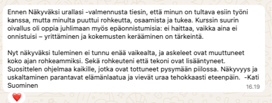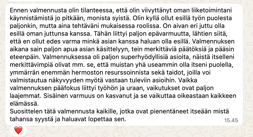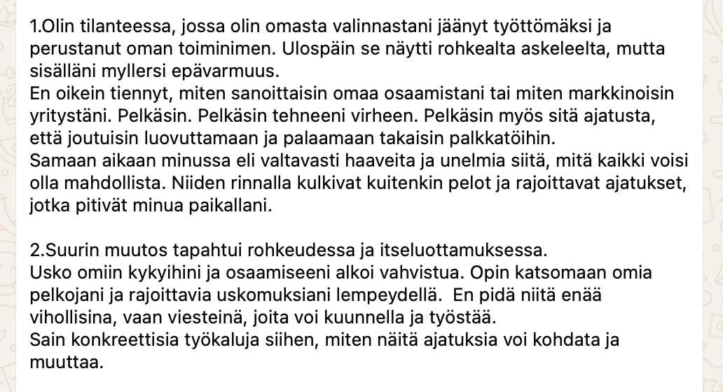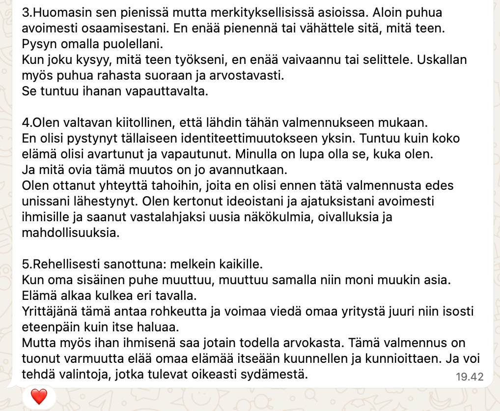 "Tuntuu niin hienolta, että tällä hetkellä, tämän valmennuksen ansiosta, uskallan ja teen oikeasti konkreettisia asioita, jotka vievät eteenpäin missiotani, joka ennen oli vain haaveina mielessäni"