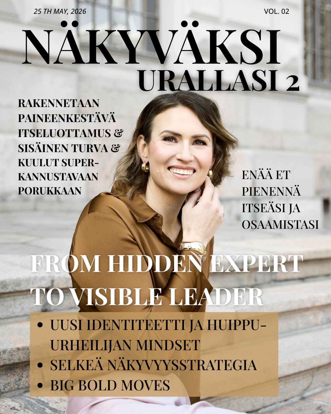 - Haluat tulla näkyväksi aitona sinuna ja pystyä tuomaan osaamisesi esille vakuuttavasti ja isosti ja rakentaa itseluottamuksen, joka kestää paineet ja myrskyt